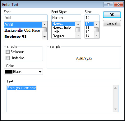 The fonts for the text are based off those installed on your computer. Choose the font type, style, size and color. Type in the text to display on the screen in the box at the bottom of the window. Press the OK button to add the text to the screen.