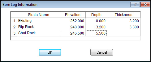 The Existing layer on line one is the original ground. Type in the name and cut compaction value for each strata layer and press the Ok button. The Bore Log Information window now displays.