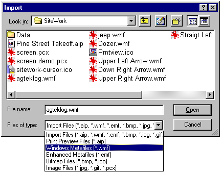 Use the drop-down menu to choose the file type. A list of available file for import display. Select the file from the list in the window. The name then displays in the File Name text box. Press the Open button to get the file. If an AGT, DWG or DXF file is imported, the screen switches to Import mode allowing you to transfer the data to the appropriate surface. Importing an AIP file automatically switches the program over to the Print Preview Page.