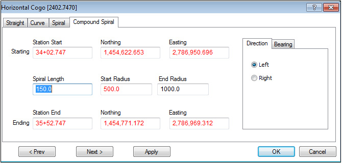 The Horizontal Cogo Editor is used to enter the horizontal geometry There are 4 types of horizontal cogo entries. Straight, Curve, Spiral, and Compound Spiral. Entered values display in black. Interpolated values display in red.