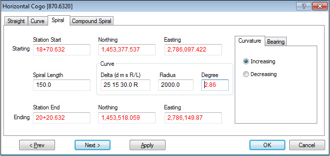 The Horizontal Cogo Editor is used to enter the horizontal geometry There are 4 types of horizontal cogo entries. Straight, Curve, Spiral, and Compound Spiral. Entered values display in black. Interpolated values display in red.