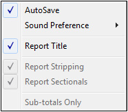 The Options Menu is used to set certain preferences in Earthwork 4D. These options changes or enables features like Auto Save and the display of a report title. Click on a command to learn more about it.