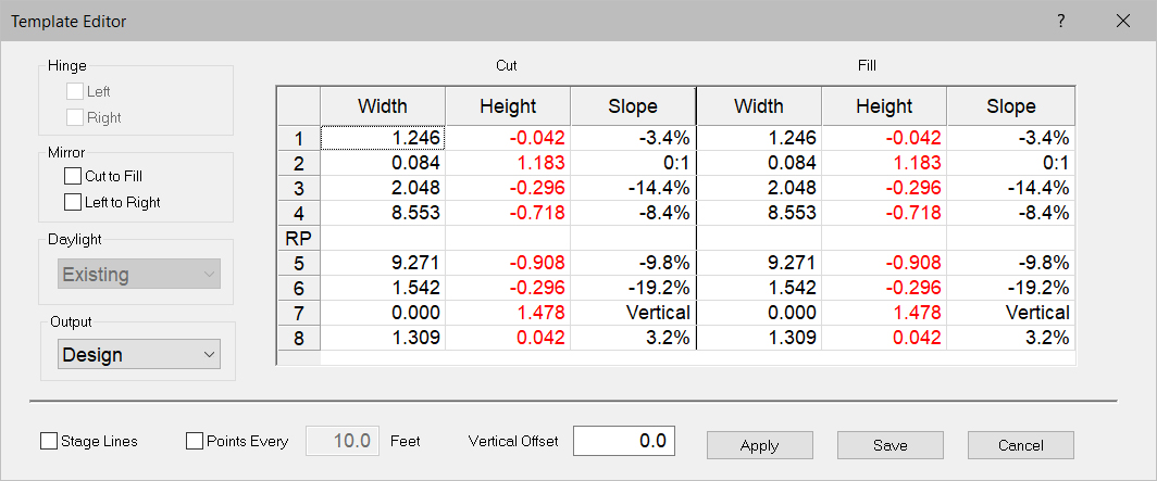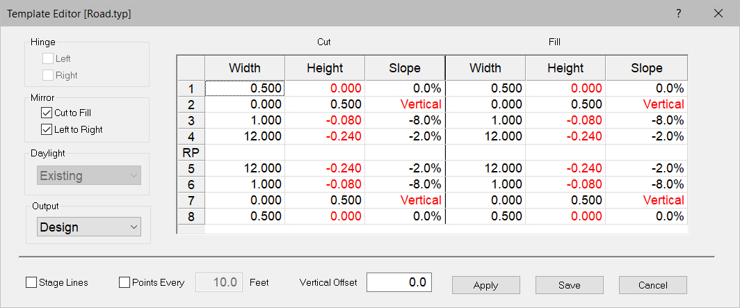 The window is split into two sides, Cut and Fill. This allows you to assign different parameters depending on the segment being in a cut or fill condition. The window is also split between left side and right side, based on the location of the reference point (RP). You may move the reference point by dragging the RP row to the desired position. A yellow diamond will mark the reference point on the template graphic. The currently selected segment will be highlighted in white.
