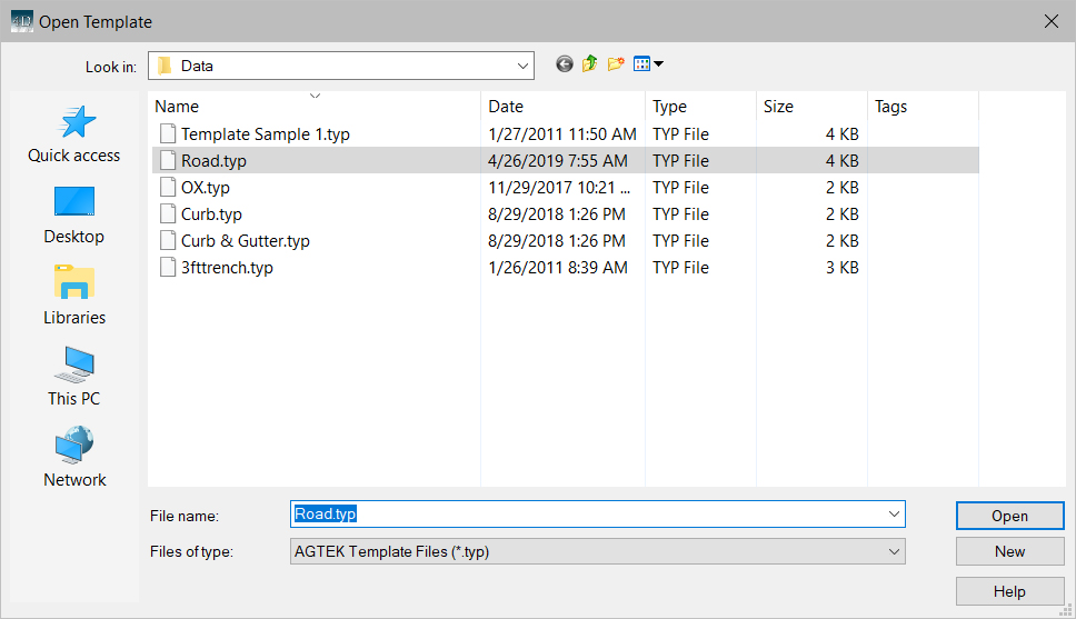 Jobs such as roads, canals, and trenches are often based on structural details or typical cross sections. Templates may be created based on a typical cross sections and applied to a chosen reference lines or multiple lines.