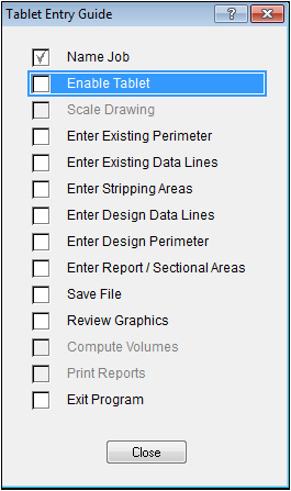 The Tablet Entry Guide is designed to assist digitized data entry. Press Guide on the menu bar and select Tablet to display the Tablet Entry Guide. Press the G key on the keyboard to activate the guide after selecting the desired guide. The suggested data entry sequence is listed from top to bottom on the list. Below is an explanation of the commands on the Data Entry Guide.