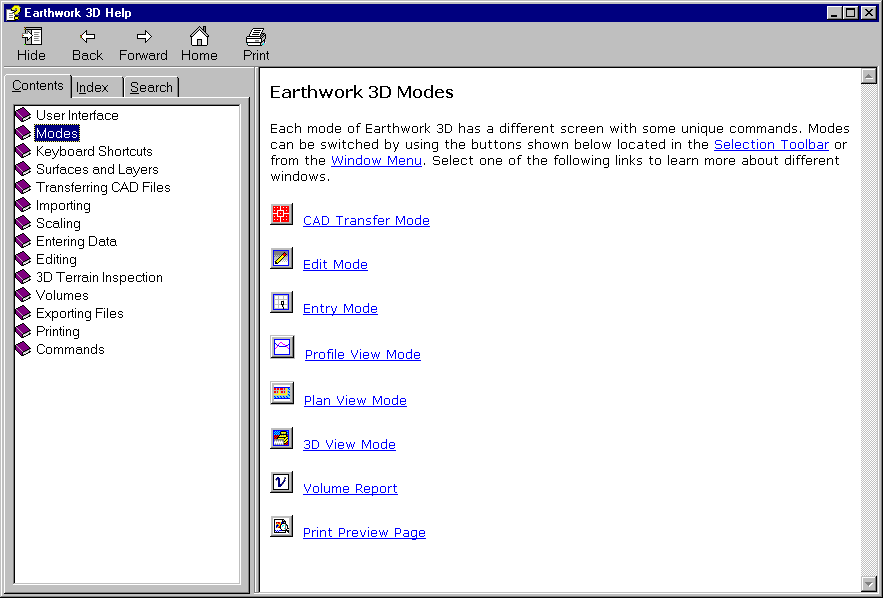 The Help window displays when Help is selected from the Help Menu. In the Help window, there are three tabs available to use in using Help.