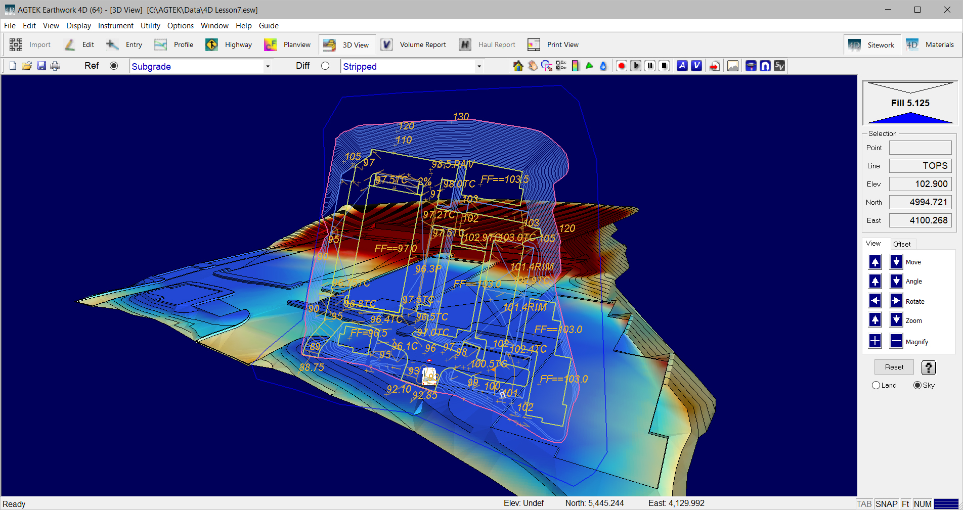 Terrain is the three-dimensional representation of a surface’s data lines color-coded by cut and fill. Purple-red represents Cut while green- blue represents fill. Areas displaying in yellow are close to the existing grade. |