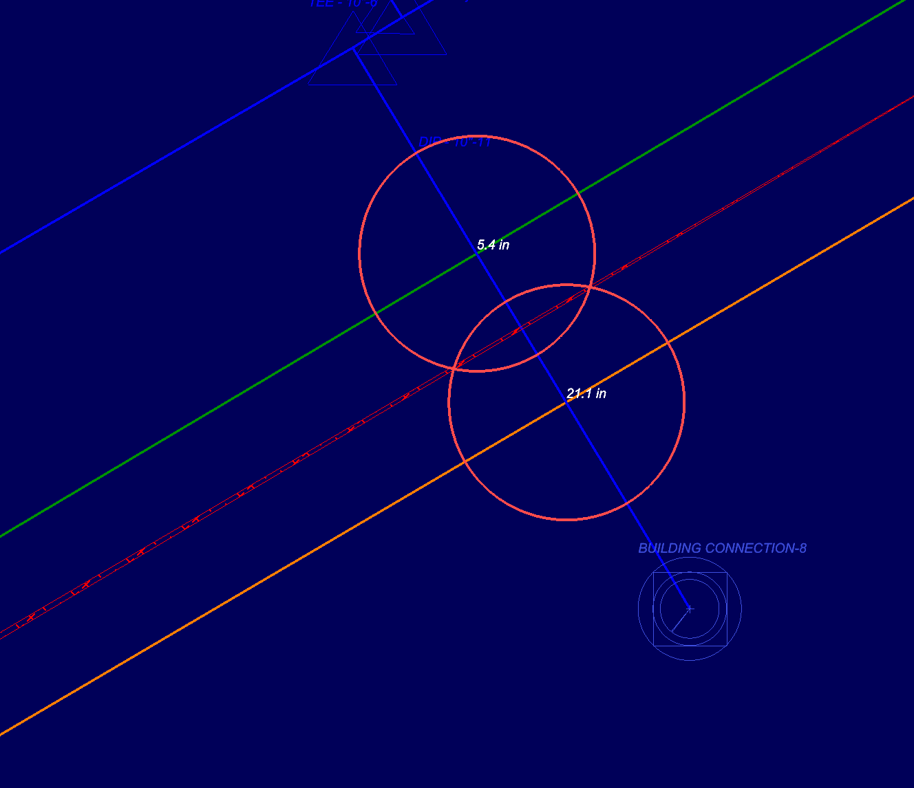 Conflicts will be marked on the plan view. Vertical conflicts will be marked with a red circle around the conflicting pipes. The distance of the overlap will be displayed in inches. The vertical conflict is calculated from the outside diameter of the pipe plus the vertical margin. Horizontal conflicts are marked with a red hatch pattern. Horizontal conflicts are measured from the center of the pipes or laterals.