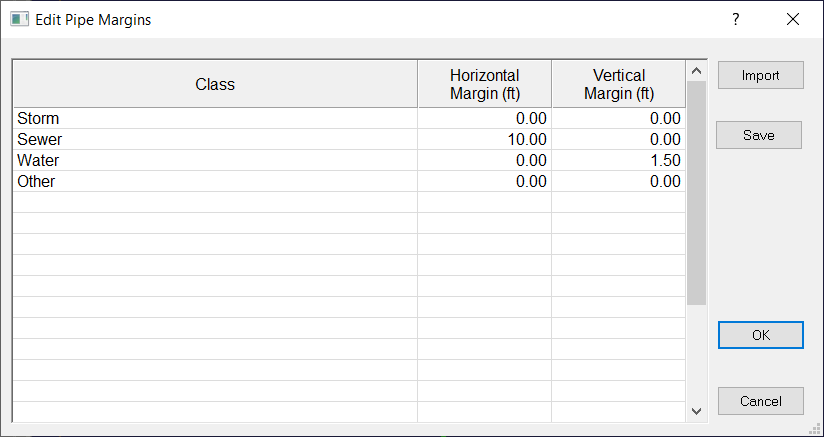 The Analyze Pipe Conflicts tool is used to identify horizontal and vertical conflicts between classes of pipes and laterals. When you click the Analyze Pipe Conflicts the first time the Edit Pipe Margins window will display.