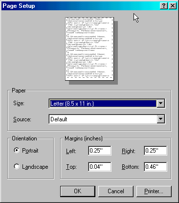 Displays the Page Setup Window allowing changes to be made to the printer properties, such as paper size, orientation, margins and which printer to use.