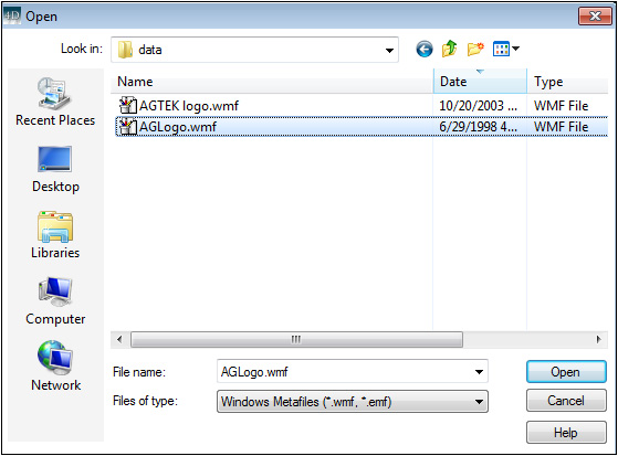 The Title Block Logo command inserts your own company logo to display in the Title Block across the bottom of the page. Only files with the .wmf extension can be inserted. When selected, the Open window displays.