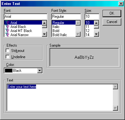 The Text dialog allows specification of the Font, Style, Size, and Color. Type in the desired text, set the specifications and press OK. The created object can be moved and sized like the other objects. Editing text on the Print Page is done by first selecting the text with the Left button and choosing the Add Text command.
