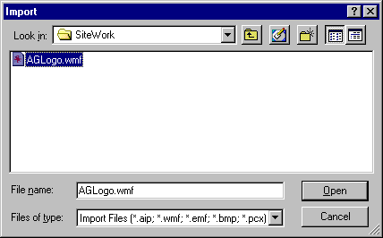 The Print Preview window also supports importation of several graphics types. Graphics are imported by selecting Import from the File menu. When selected, the Import window displays.