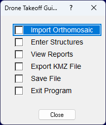 The Materials Drone Takeoff Guide is designed to assist data entry from drone orthomosaic TIF image. Press Guide on the menu bar and select Drone Takeoff to display the Materials Drone Takeoff Guide. Press the G key on the keyboard to activate the guide after selecting the desired guide. The suggested data entry sequence is listed from top to bottom on the list. Below is an explanation of the commands on the PDF Entry Guide.